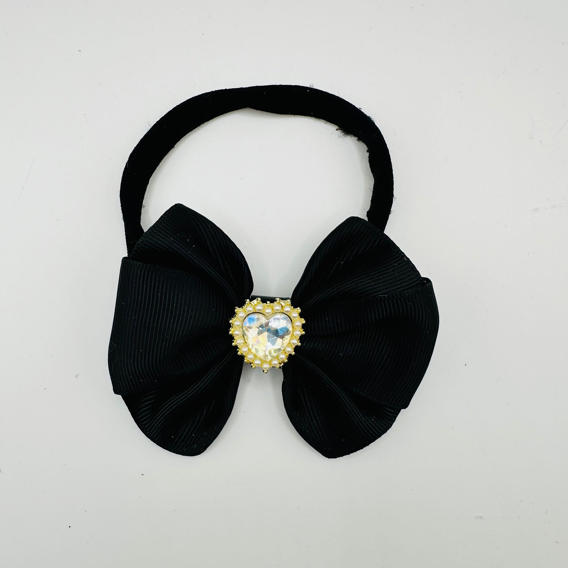 This gorgeous black ribbon blanket w is embellished with a white rhinestone heart and on a black nylon headband